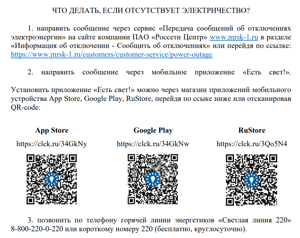 3. позвонить по телефону горячей линии энергетиков «Светлая линия 220»